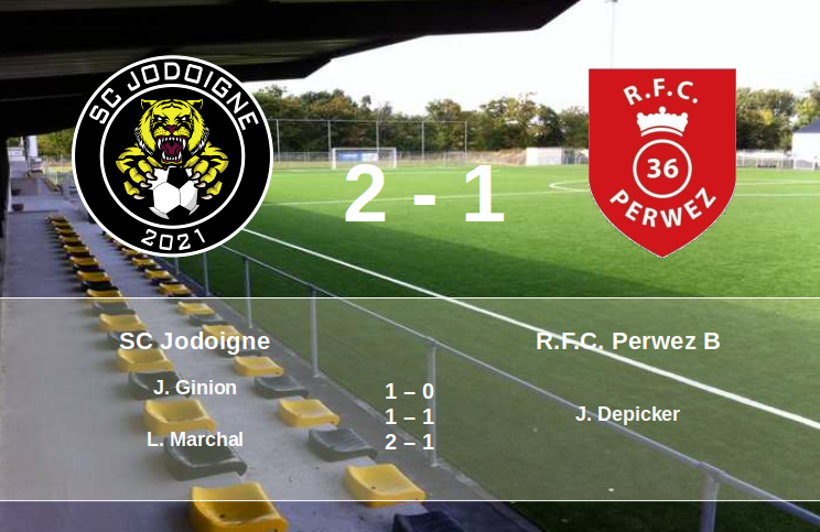 4Sep P3 Hommes: SC Jodoigne 2 – 1 R.F.C. Perwez B 2 septembre 2021Evènements , News Notre équipe continue sur sa belle série. ⚔🐯 Victoire 2 - 1 contre nos voisins du RFC Perwez B. Les buts ont été inscris par J. Ginion et L. Marchal ⚽ Du samedi 04/09 à 20:00 au samedi 04/09 à 23:00